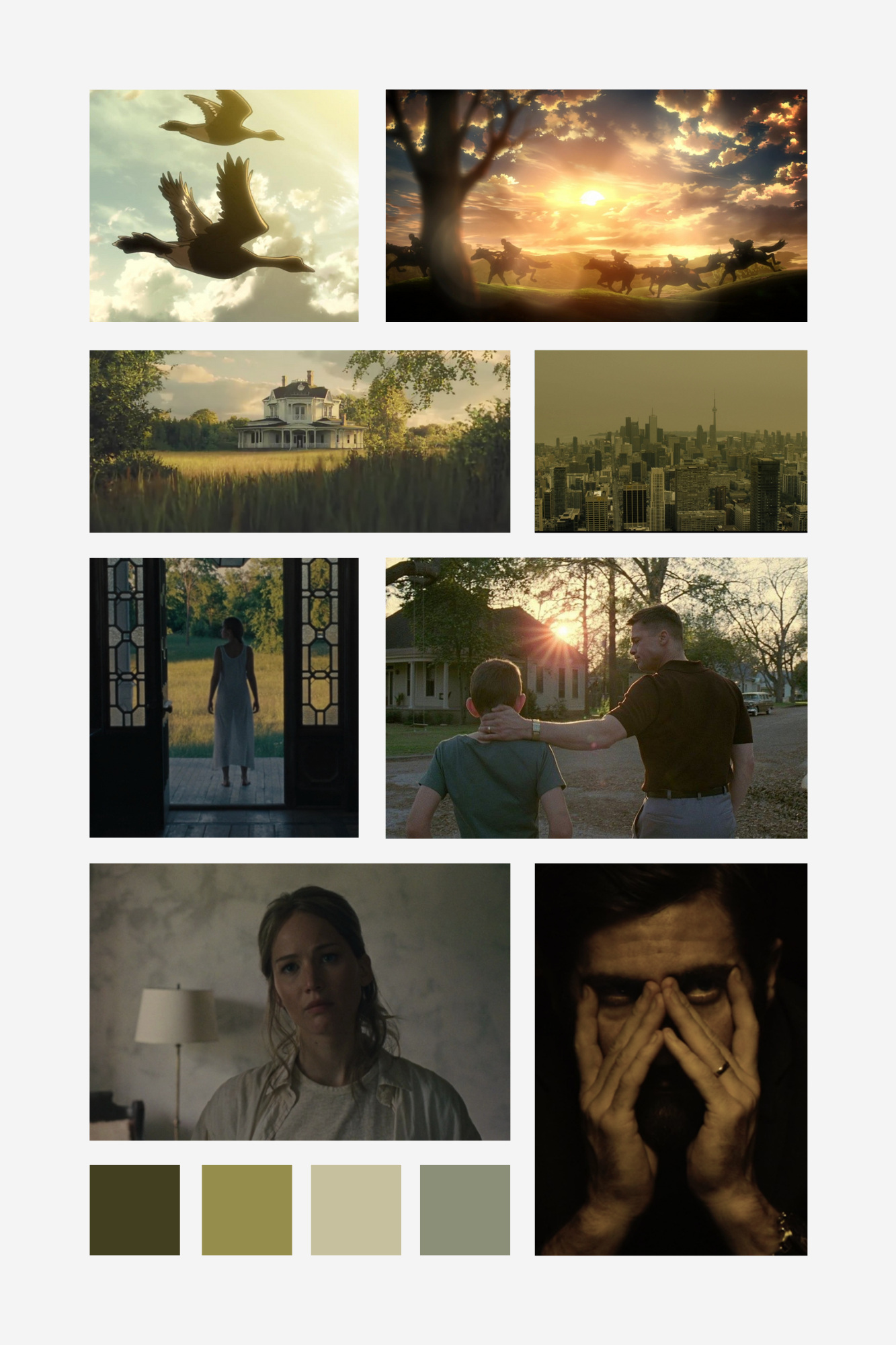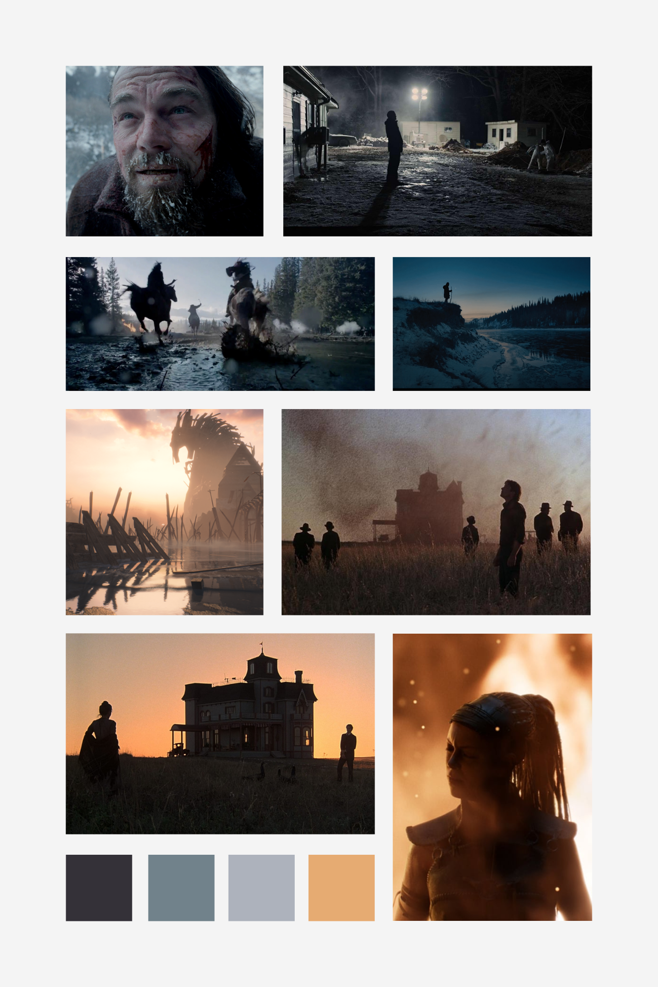 In order of appearance: The Revenant (Alejandro González Iñárritu), Prisoners (Denis Villeneuve), Hellblade: Senua's Sacrifice (Ninja Theory), Days of Heaven (Terrence Malick), Attack On Titan (Tetsurō Araki), Mother! (Darren Aronofsky) & The Tree Of Life (Terrence Malick).